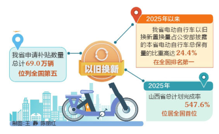 2025年以來(lái),我省電動(dòng)自行車(chē)以舊換新置換量占公安部披露的本省電動(dòng)自行車(chē)總保有量的比重高達(dá)24.4%,在全國(guó)排名第一。以2025年全國(guó)建議工作量計(jì)算,山西省的總計(jì)劃完成率達(dá)到547.6%,位居全國(guó)首位。