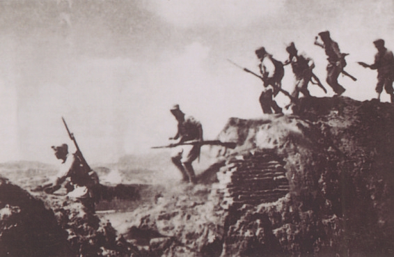 圖12 1938年春,晉西北抗日根據(jù)地軍民打退日軍的五路圍攻,收復(fù)寧武、神池等7座縣城。圖為部隊(duì)在收復(fù)寧武縣城戰(zhàn)斗中。