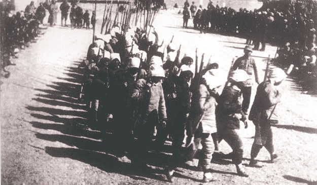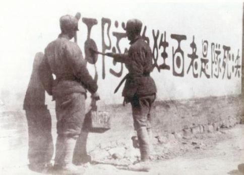 圖2 山西新軍既是戰(zhàn)斗隊(duì),又是工作隊(duì)。他們走到哪里,宣傳到哪里,動(dòng)員青年參軍;組織人民武裝自衛(wèi)隊(duì)、游擊隊(duì);協(xié)助地方建黨、建政,組建工、農(nóng)、青、婦等群眾團(tuán)體,創(chuàng)建抗日根據(jù)地。圖為1938年初,決死隊(duì)?wèi)?zhàn)士在沁縣書寫宣傳標(biāo)語(yǔ)。