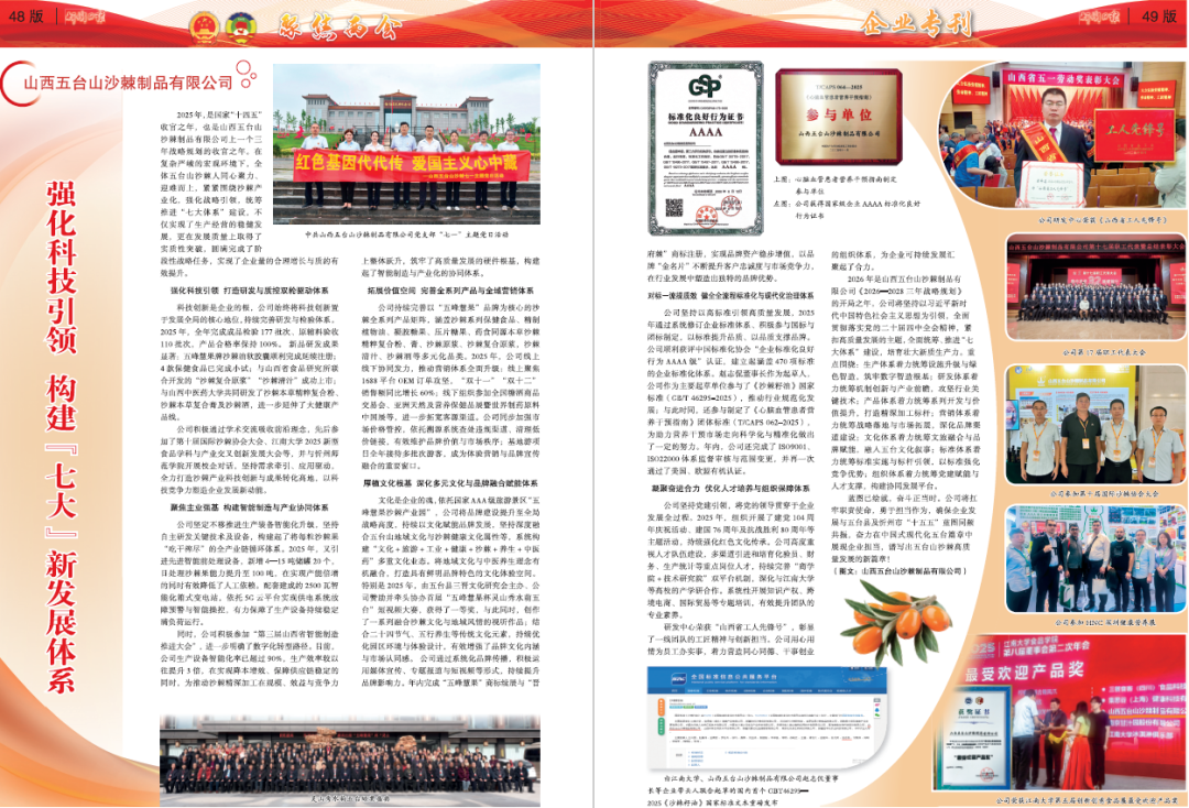 2025年,是國家“十四五”收官之年,也是山西五臺山沙棘制品有限公司上一個三年戰(zhàn)略規(guī)劃的收官之年。在復(fù)雜嚴峻的宏觀環(huán)境下,全體五臺山沙棘人同心聚力、迎難而上,緊緊圍繞沙棘產(chǎn)業(yè)化,強化戰(zhàn)略引領(lǐng),統(tǒng)籌推進“七大體系”建設(shè),不僅實現(xiàn)了生產(chǎn)經(jīng)營的穩(wěn)健發(fā)展,更在發(fā)展質(zhì)量上取得了實質(zhì)性突破,圓滿完成了階段性戰(zhàn)略任務(wù),實現(xiàn)了企業(yè)量的合理增長與質(zhì)的有效提升。